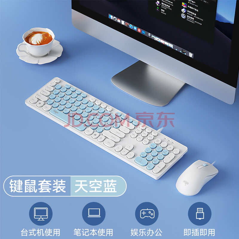 商品相册:爱国者(aigo)AK200天空蓝 键鼠套装 有线连接 USB即插即用 复古圆形键帽 商务办公 笔记本台式通用键盘鼠标第