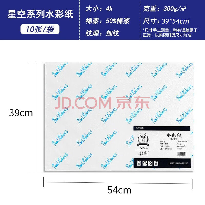 商品相册:鲁本斯(PaulRubens)星空水彩纸加厚4K细纹300g棉浆纸素描纸学生初学美术绘画纸10张/包0111084第