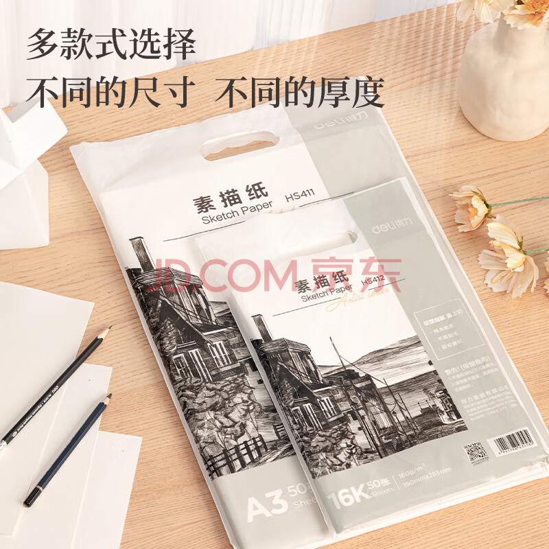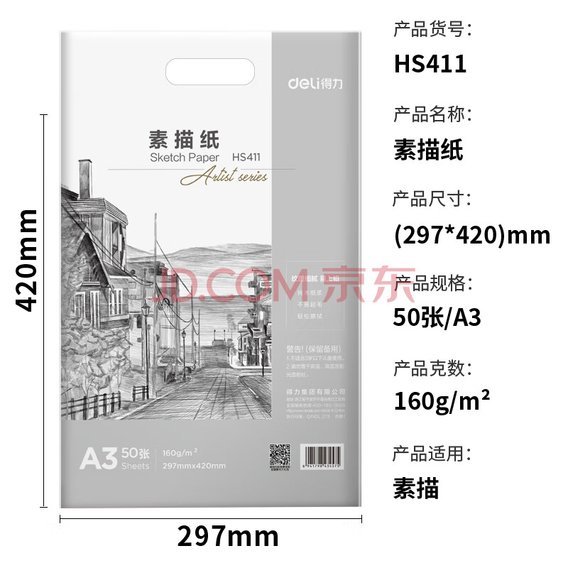 商品相册:得力(deli)素描纸A3-160g-50张绘画纸彩铅画手绘临摹学生用初学者铅画纸第