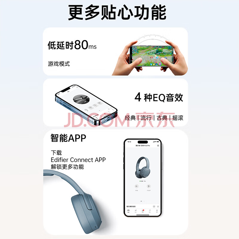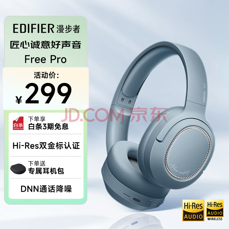 商品相册:漫步者(EDIFIER)Free Pro 主动降噪耳机 头戴蓝牙耳机 手机耳机 音乐耳机 雾霾蓝第