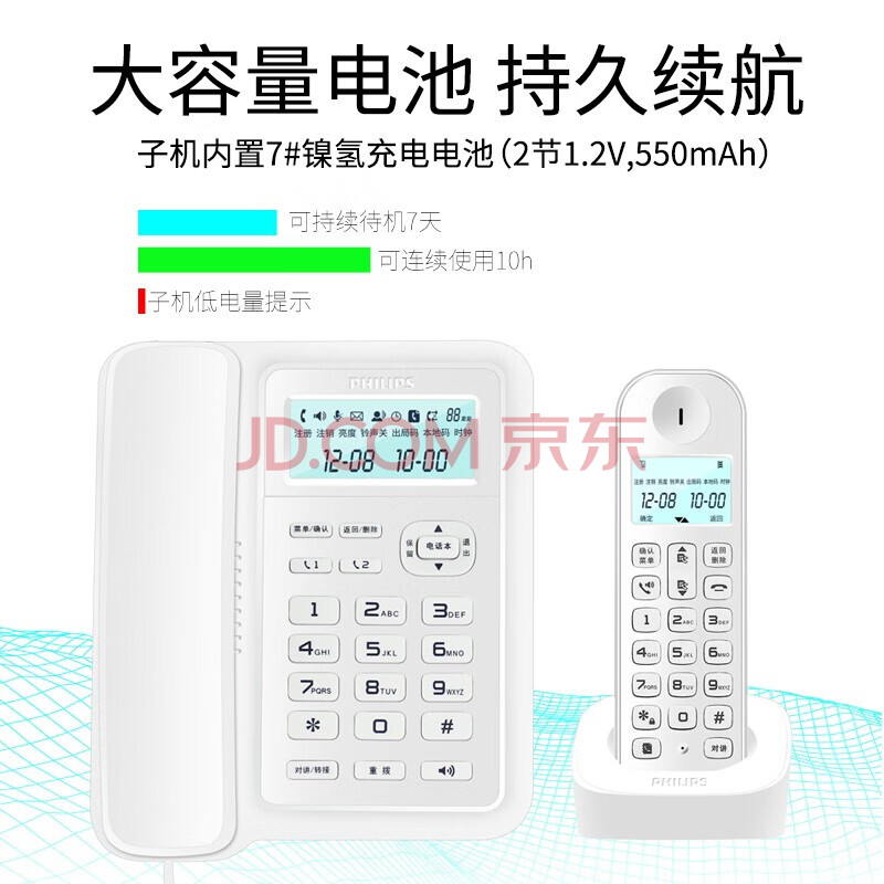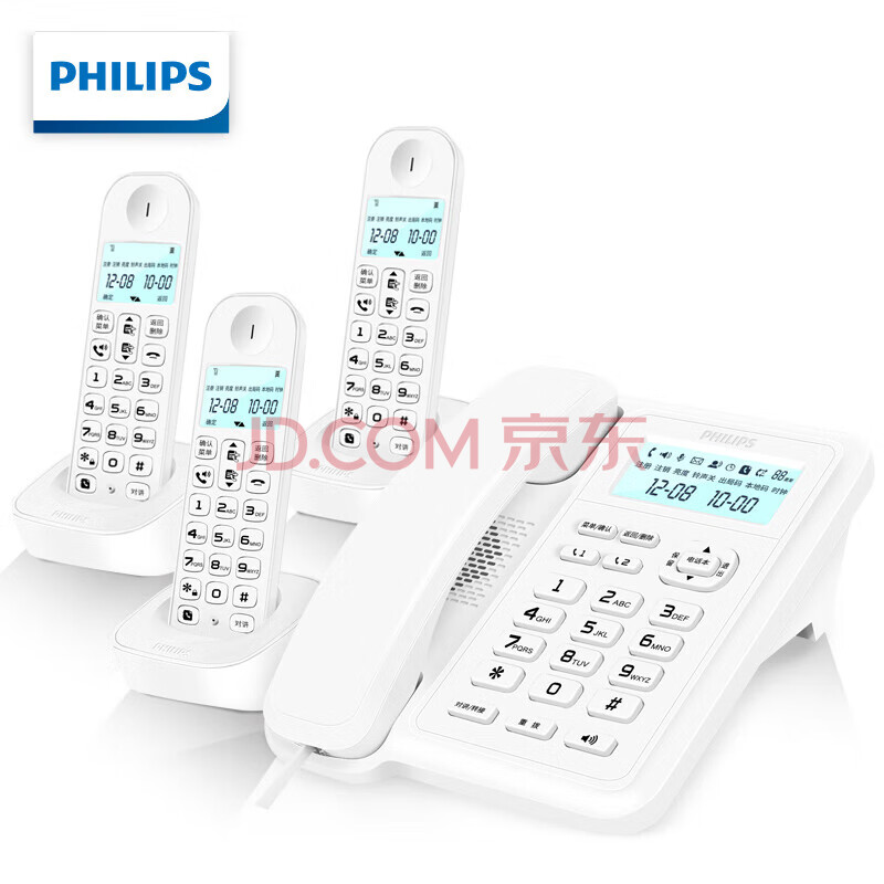商品相册:飞利浦(PHILIPS)数字无绳电话机 无线座机 子母机 办公家用 信号覆盖广 屏幕白色背光 DCTG167一拖三白色第