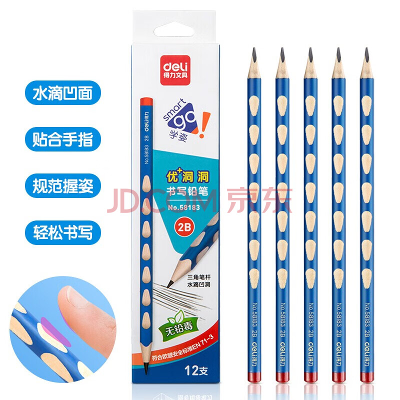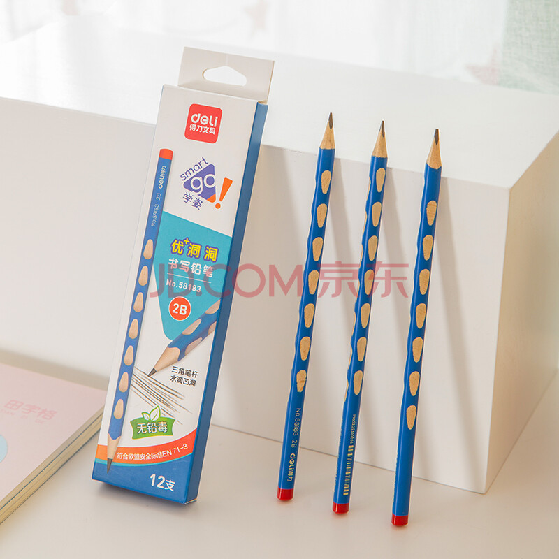 商品相册:得力(deli)洞洞笔铅笔12支2B铅笔三角杆易抓握儿童矫姿铅笔学生练字笔58183学生开学文具第