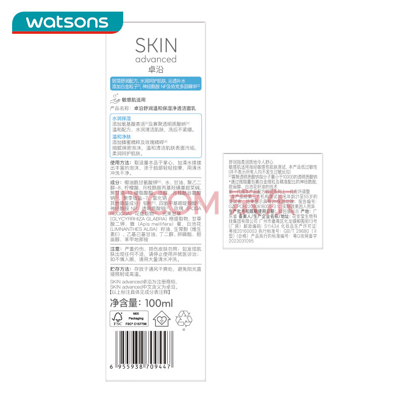 商品相册:屈臣氏卓沿舒润温和保湿净透洁面乳100ml温和洁面 敏感肌适用第