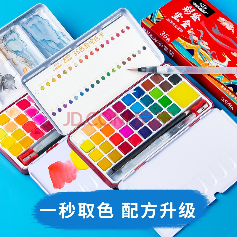 商品相册:中盛画材(transon)36色固体水彩颜料8件套装 铁盒便携手绘画工具套装水彩粉饼 含水彩纸本自来水彩画笔美术写生第