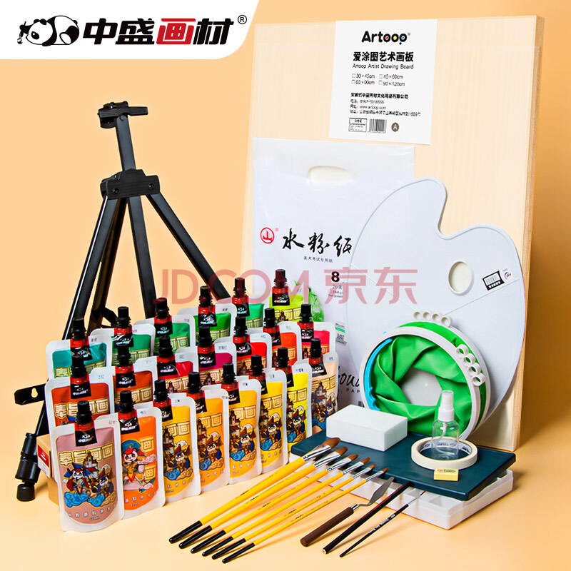 商品相册:【全网低价】中盛画材 【含画架画板】36色水粉颜料套装初学者工具箱儿童水粉画笔洗笔桶美术生专业艺考画材集训画画纸美术写生第