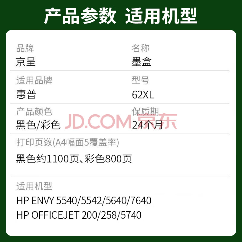 商品相册:京呈62XL黑彩墨盒套装适用HP 62XL墨盒惠普hp OfficeJet 258 200 208 5740移动便携式打印机5540 5542 5640 7640第