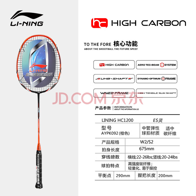 商品相册:李宁(LI-NING)羽毛球拍HC1200全碳素4U进阶型训练单拍 AYPK092-3 橙色第