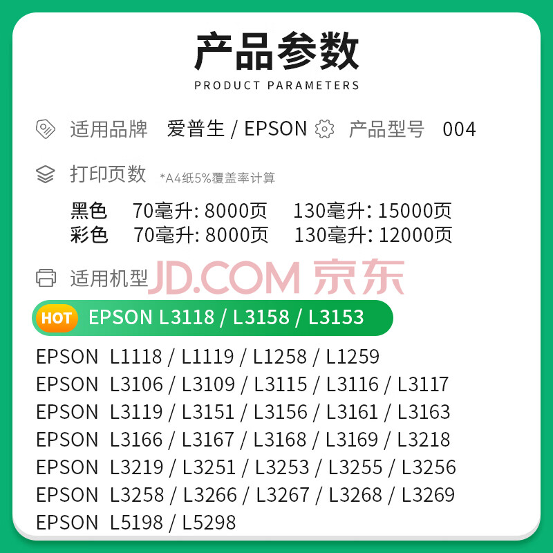 商品相册:才进适用爱普生004墨水套装黑彩色L3118 L3158 L3153 L3258 L3218 3119打印机3251 1118 3219 3256 3151 3253第