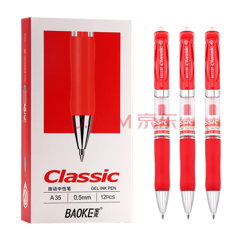 商品相册:宝克(BAOKE)A35 0.5mm红色按动中性笔办公签字笔 子弹头水笔12支/盒第
