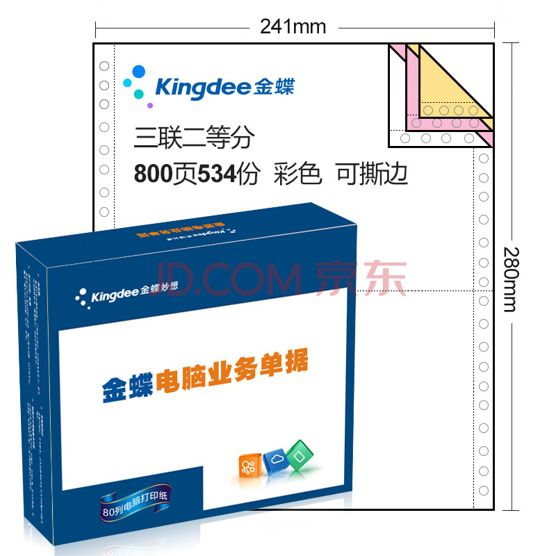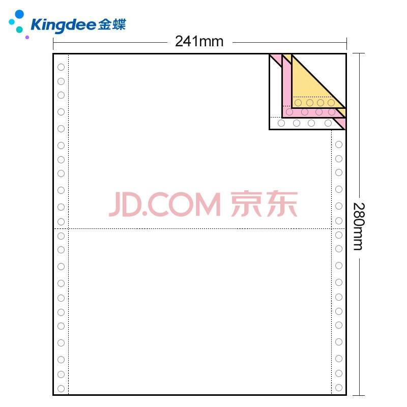 商品相册:金蝶(kingdee)三联二等分撕边电脑打印纸 彩色针式打印纸(241-3-1/2S 色序:白红黄 800页/箱)第