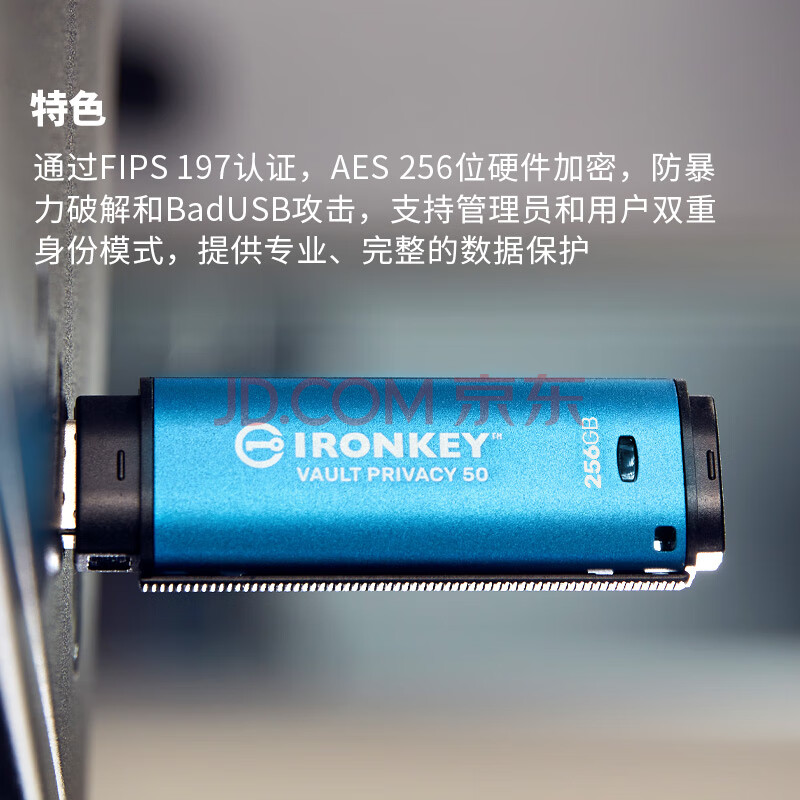 商品相册:金士顿(Kingston)256GB U盘 IKVP50 256位AES专业硬件金属加密优盘 双重写保护 读速高达230MB/s第1张/共4