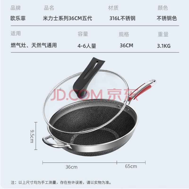 商品相册:欧乐菲(OLOFE)316L不锈钢炒锅蜂窝平底炒炖菜锅不粘爆炒烹饪锅具燃气灶通用36cm第