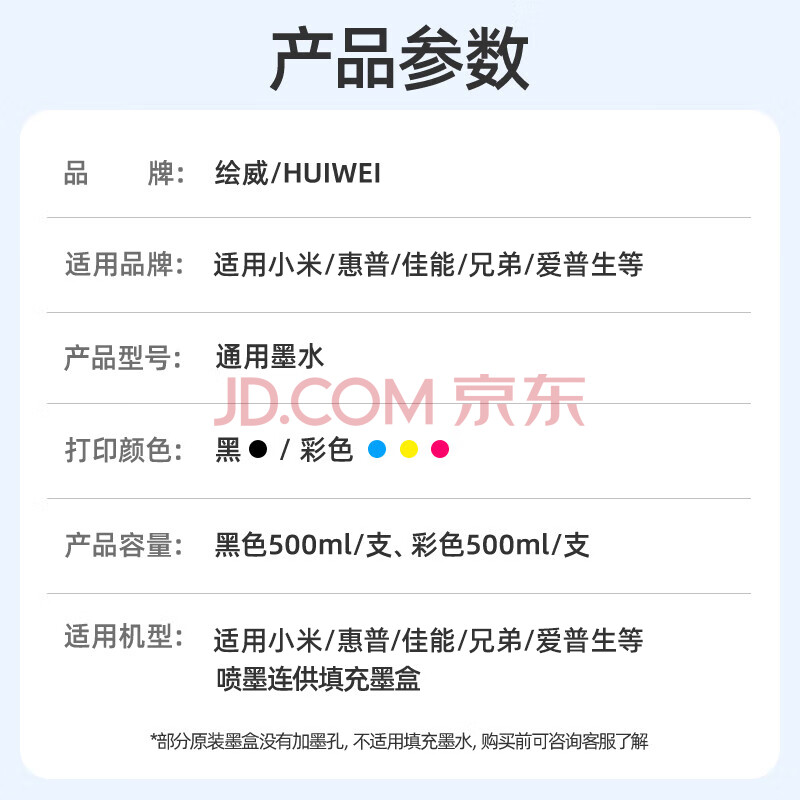 商品相册:绘威适用爱普生 惠普 佳能 适用小米喷墨打印机墨水 803墨盒墨水 500ml连供填充彩色通用墨水染料 四色套装墨水第