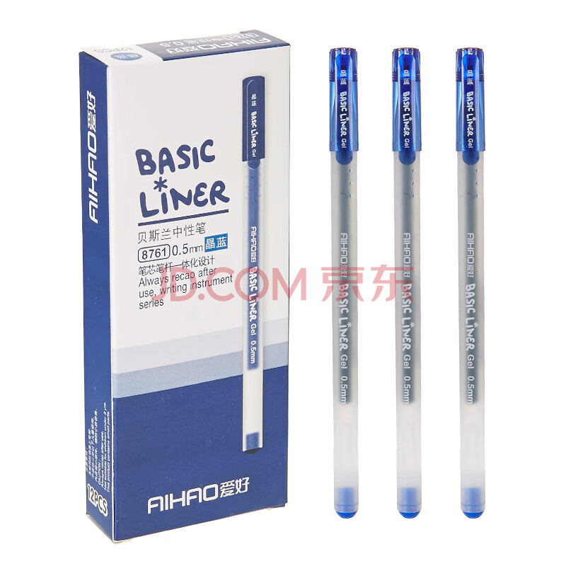 商品相册:爱好(AIHAO)大容量中性笔0.5MM全针管晶蓝色中性笔签字笔 笔芯笔身一体化12支/盒 8761第