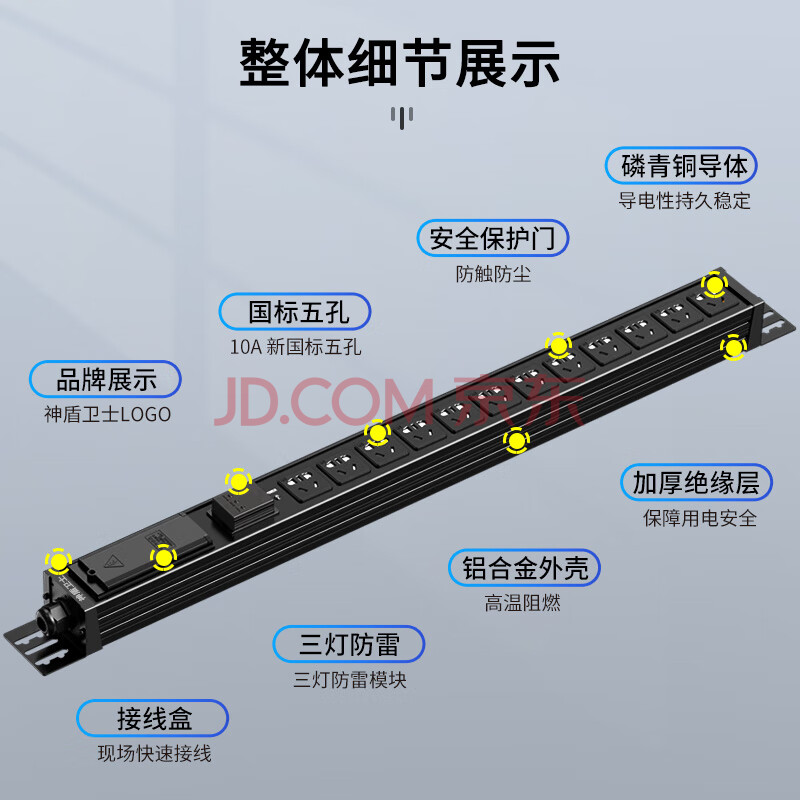 商品相册:神盾卫士(SDWS)PDU机柜插座12位32A大功率插线板新国标三灯防雷竖装工业连接器接线盒不带线SV022BD第