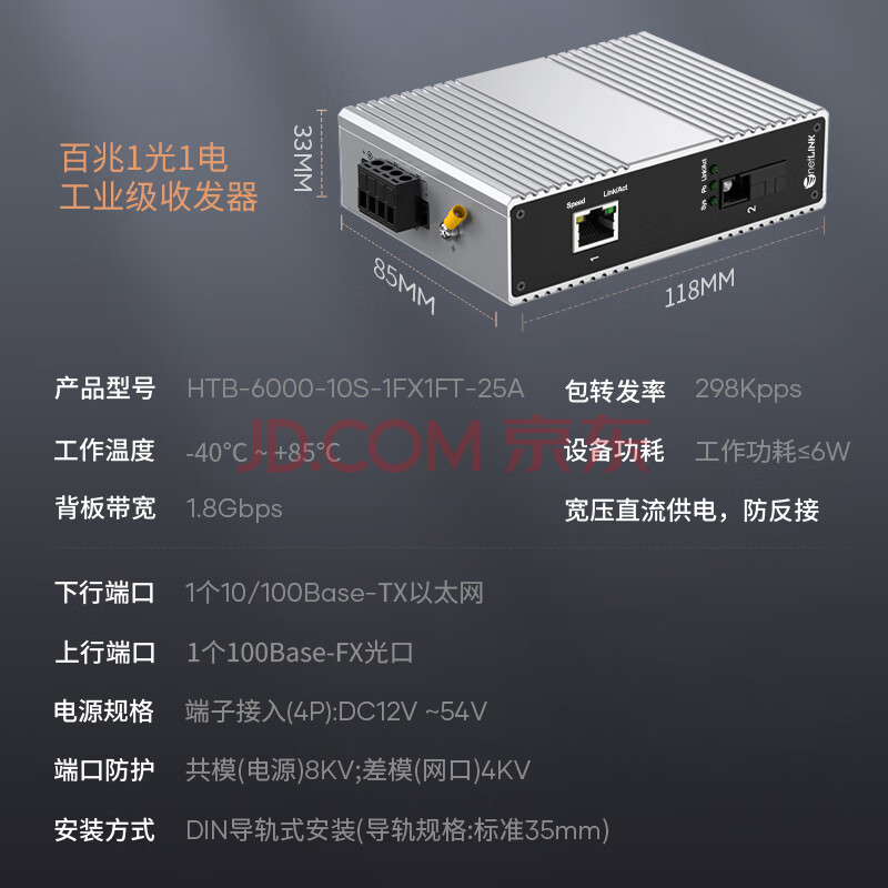 商品相册:netLINK工业级光纤收发器 百兆1光1电单模单纤A端导轨式光电转换器一台 HTB-6000-10S-1FX1FT-25A第