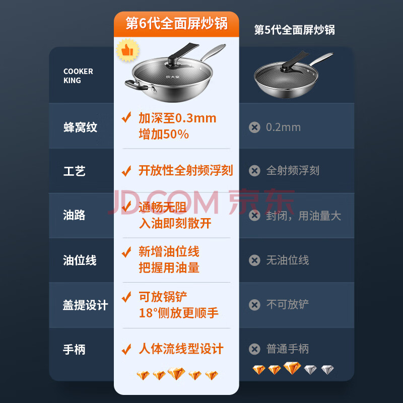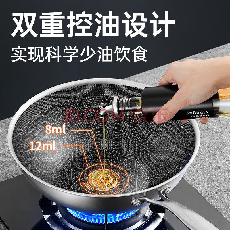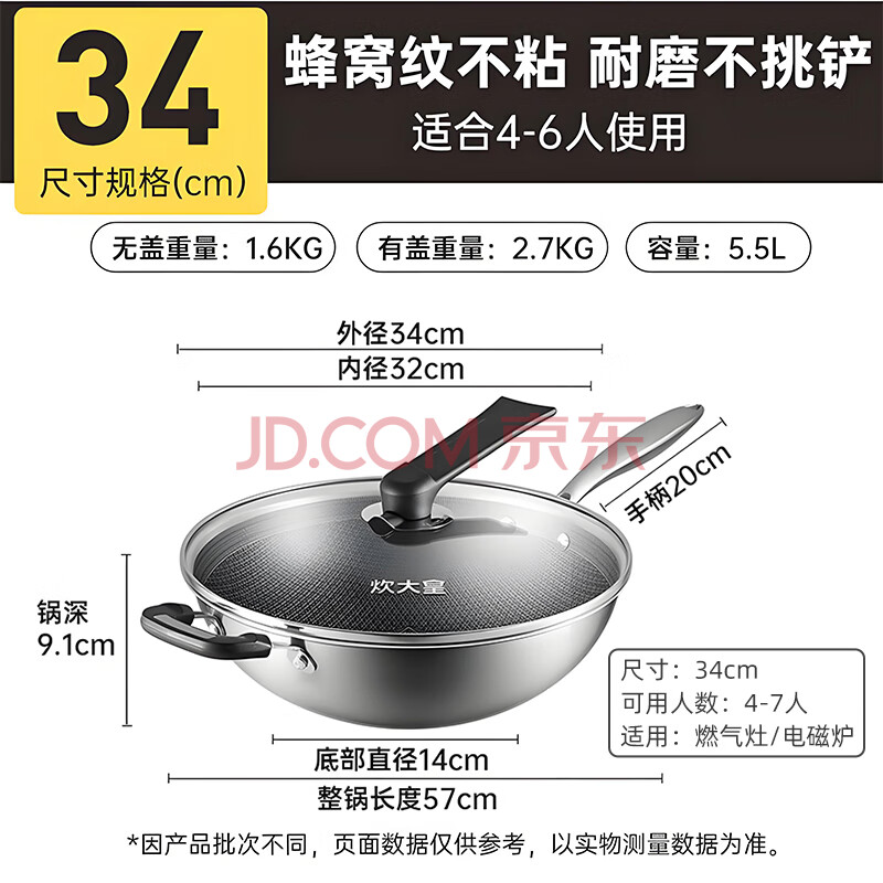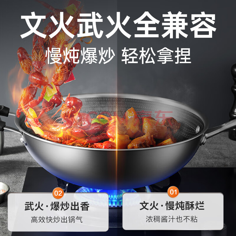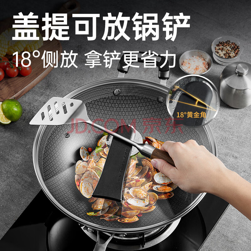 商品相册:炊大皇炒锅 304不锈钢含钛炒菜锅平底不粘炒锅34cm 可立可视盖不挑灶第