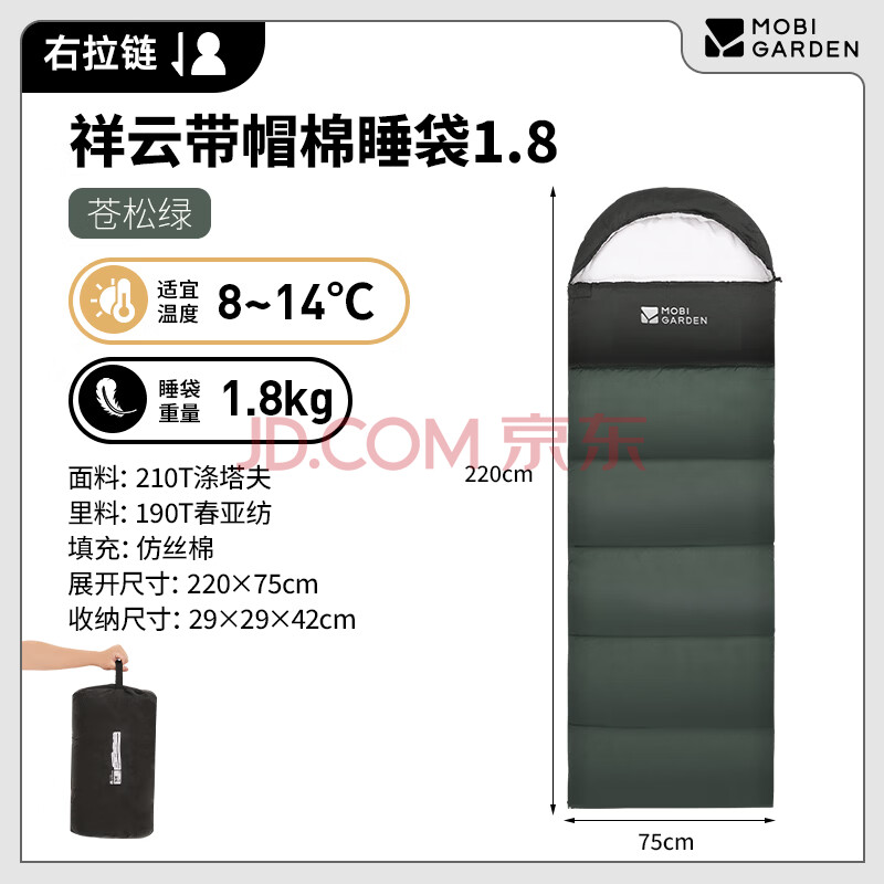 商品相册:牧高笛(MOBIGARDEN)睡袋 户外露营可拼接单人保暖睡袋祥云1.8 EX19562005 苍松绿/右第