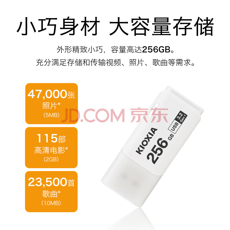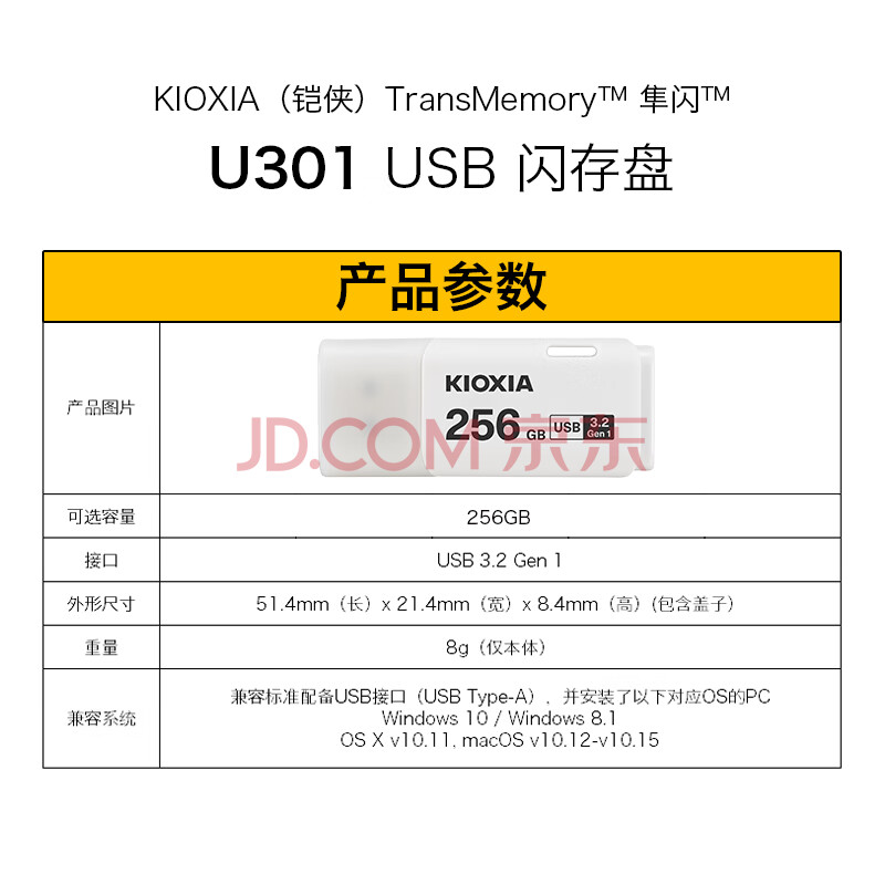 商品相册:铠侠(Kioxia)256GB U盘 U301隼闪系列 白色 USB 3.2接口 时尚设计 高速传输 办公学习车载娱乐 兼容苹果系统第