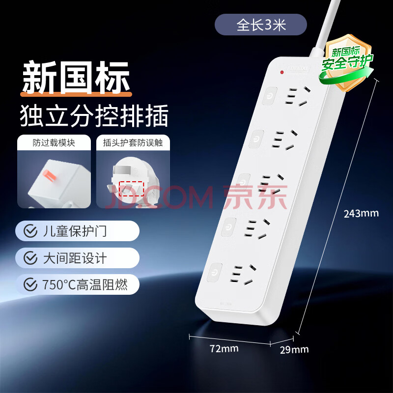 商品相册:德力西(DELIXI) 3C认证国标分控带开关插座/插排/排插/插线板/接线板/拖线板 5位独立开关全长3米第