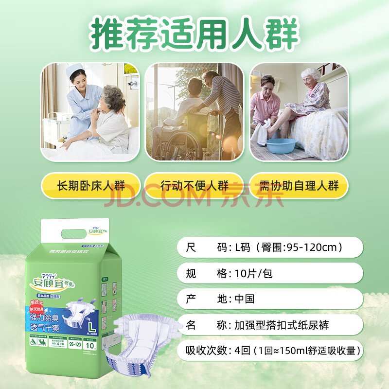 商品相册:安顾宜舒爽加强纳米消臭成人搭扣纸尿裤L10片臀围:95-120cm老年人尿不湿第