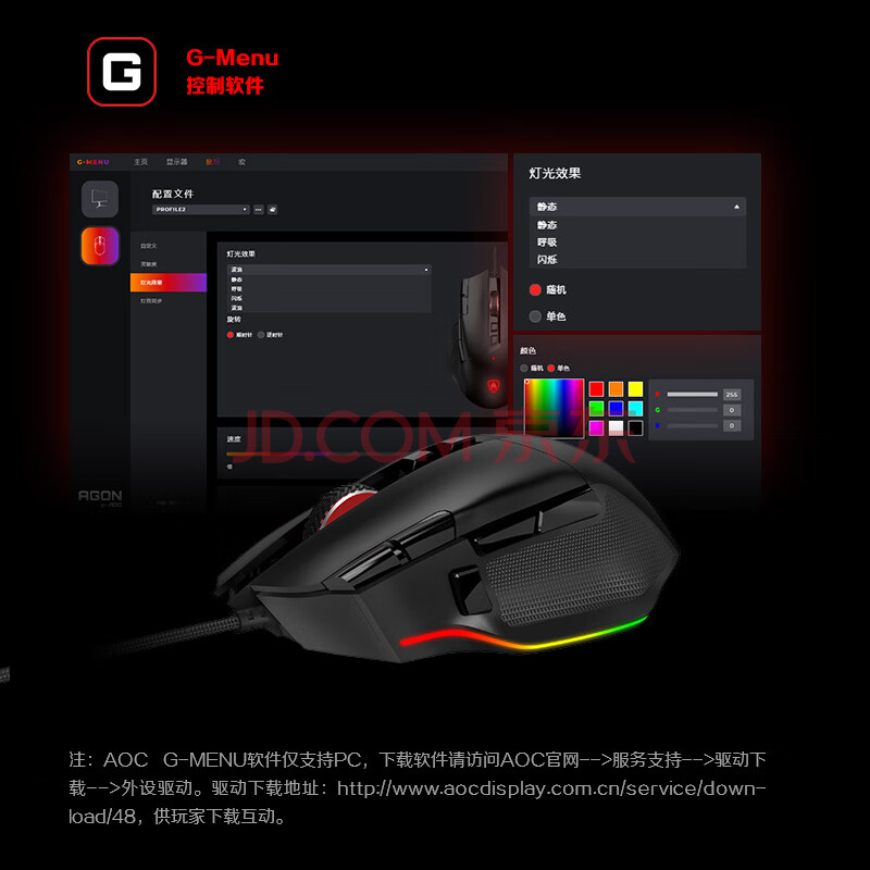 商品相册:AOC AGON 游戏鼠标 有线鼠标 原生16000DPI RGB灯效同步 10键自定义编程 哑UV涂层 电竞幻彩鼠标 黑色 AGM600第