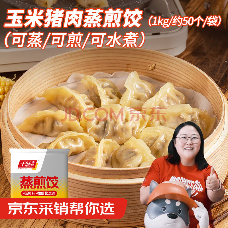 商品相册:千味央厨玉米猪肉蒸煎饺1kg/50只早餐食品半成品早饭速食锅贴水饺速冻饺子第1张/共7