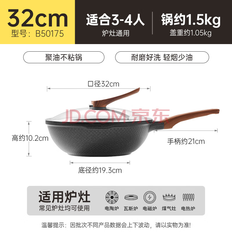商品相册:炊大皇炒锅聚油不粘锅耐磨轻烟少油多用平底煎炒锅32cm磁炉通用B50175第