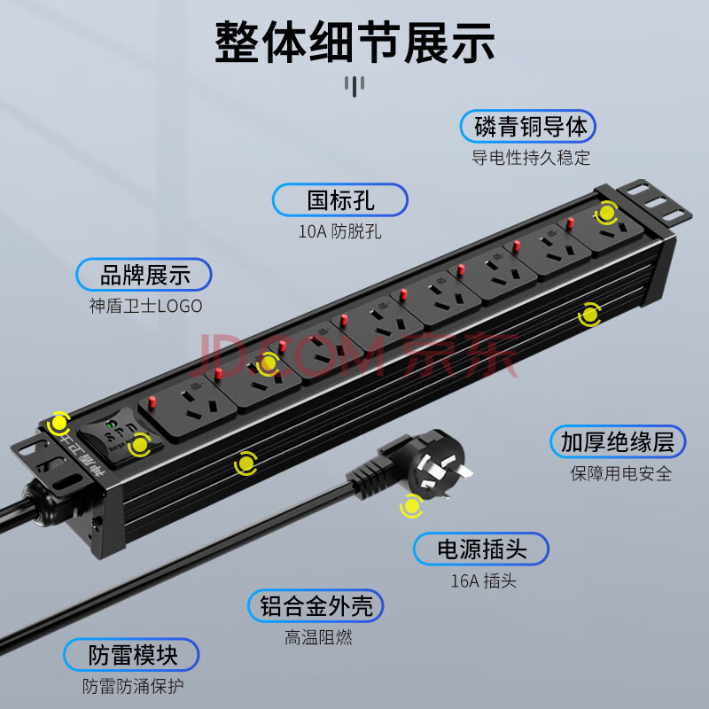 商品相册:神盾卫士(SDWS)PDU机柜插座8位16A大功率插线板新国标开关防脱插排可定制SC3865F第