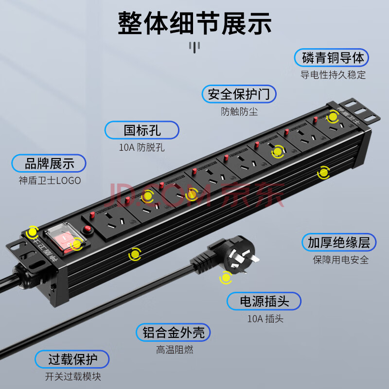 商品相册:神盾卫士(SDWS)PDU机柜插座8位10A大功率插线板新国标开关过载防脱插排可定制SC38057F第