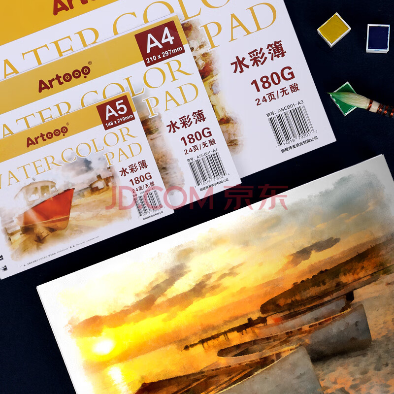 商品相册:中盛画材A5水彩本180g水彩纸木浆纸手绘插画水彩速写本纸便携写生四面封胶水彩画本24页/本美术写生第