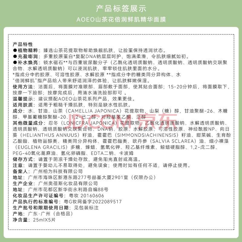 商品相册:AOEO山茶花精华面膜水嫩弹润保湿舒缓男女25ml*5片第