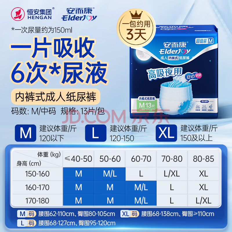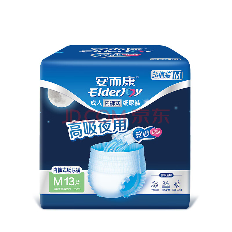 商品相册:安而康(Elderjoy)超值装夜用型成人拉拉裤M13片臀围80-105cm产褥裤100%原生木浆第