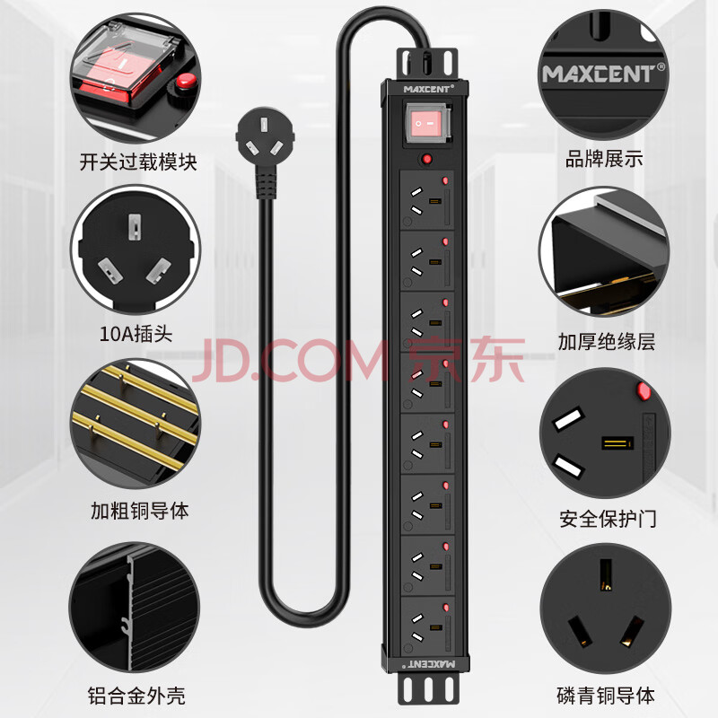商品相册:麦森特(MAXCENT)PDU机柜插座8位10A大功率插线板新国标开关过载防脱插排可定制MC38057F第