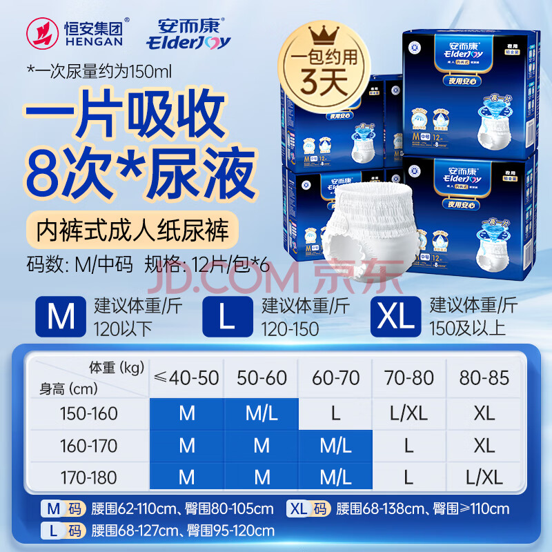 商品相册:安而康(Elderjoy)夜用安心成人拉拉裤M72片臀围80-105cm内裤式纸尿裤卧床夜间安睡第