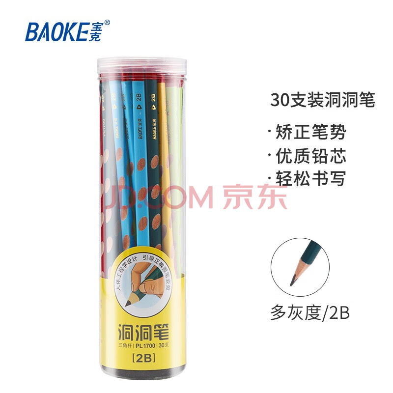 商品相册:宝克(BAOKE)PL1700 洞洞铅笔2B三角杆铅笔 学生练字笔 儿童矫姿铅笔 30支/桶第