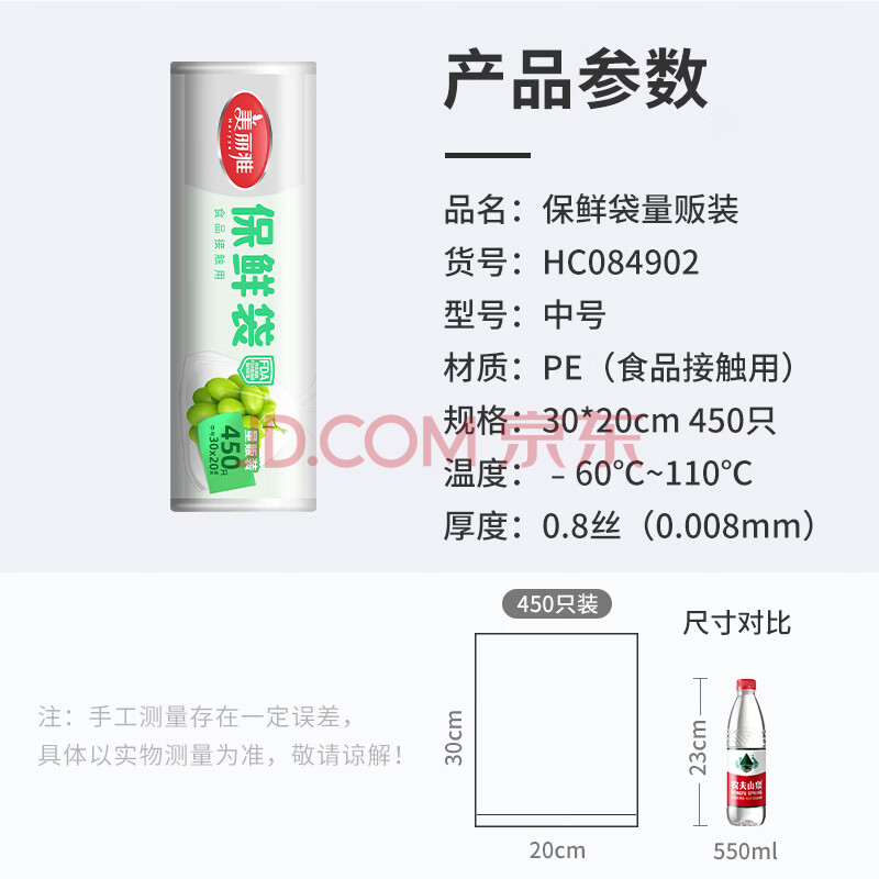 商品相册:美丽雅加厚保鲜袋450只中号30*20cm 点断式食品级家用塑料连卷袋子第