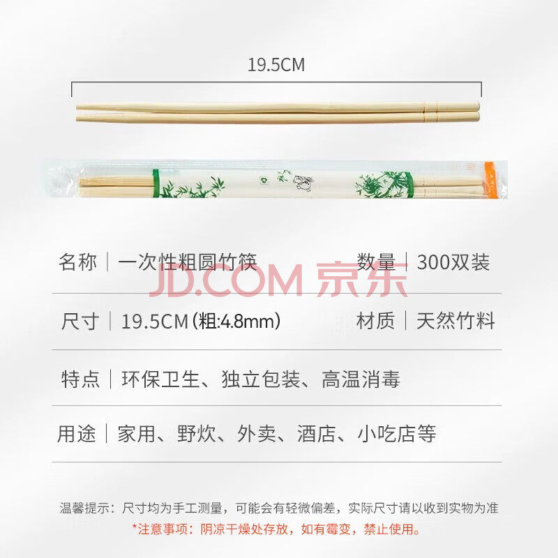 商品相册:特美居(temeiju)一次性筷子独立包装家用野营方便快餐竹筷外卖餐具粗圆筷300双第