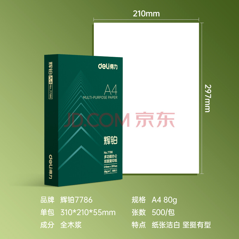 商品相册:得力(deli)辉铂A4打印纸 80g500张单包复印纸 进口原纸 双面加厚草稿纸 打印作业 书写绘画 7786【品质升级】第