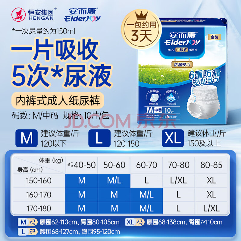 商品相册:安而康(Elderjoy)防漏安心成人拉拉裤M10片臀围80-105cm内裤式成人纸尿裤易穿脱第
