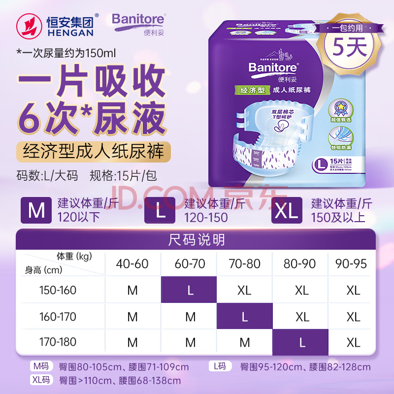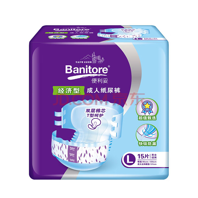 商品相册:便利妥(Banitore)经济型成人纸尿裤L码15片(臀围95-120cm) 防漏尿不湿透气恒安第