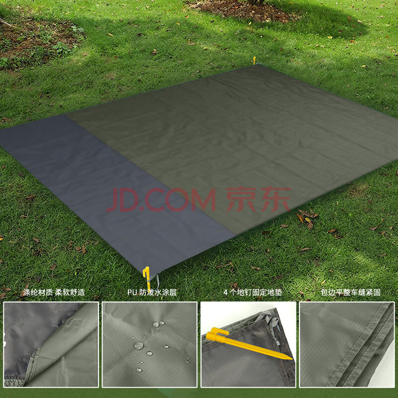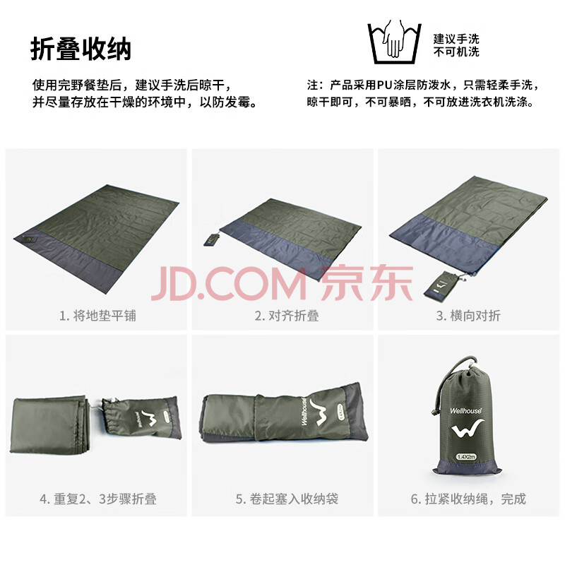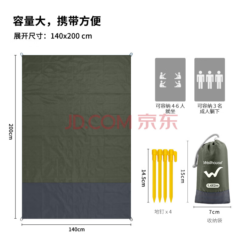 商品相册:WELLHOUSE户外防潮垫折叠帐篷垫子沙滩野餐垫地钉收纳袋 军绿色1.4*2m第