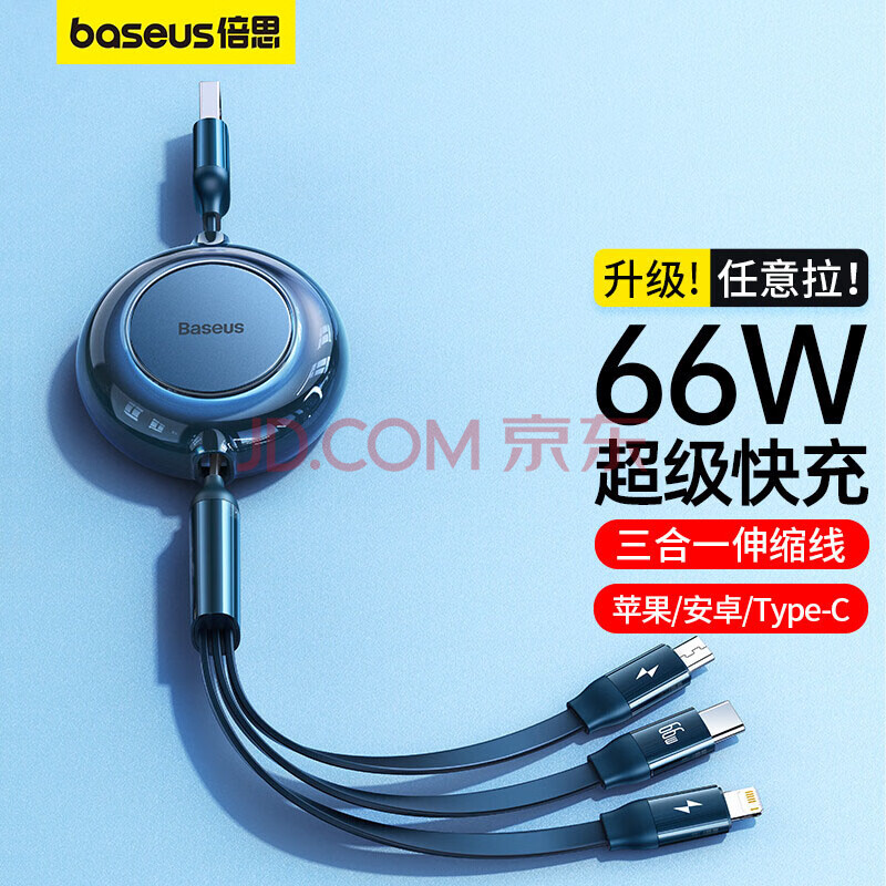 商品相册:倍思数据线三合一充电线6A快充66W伸缩一拖三Type-C 适用苹果14/13小米华为mate70小米手机车载 蓝色第