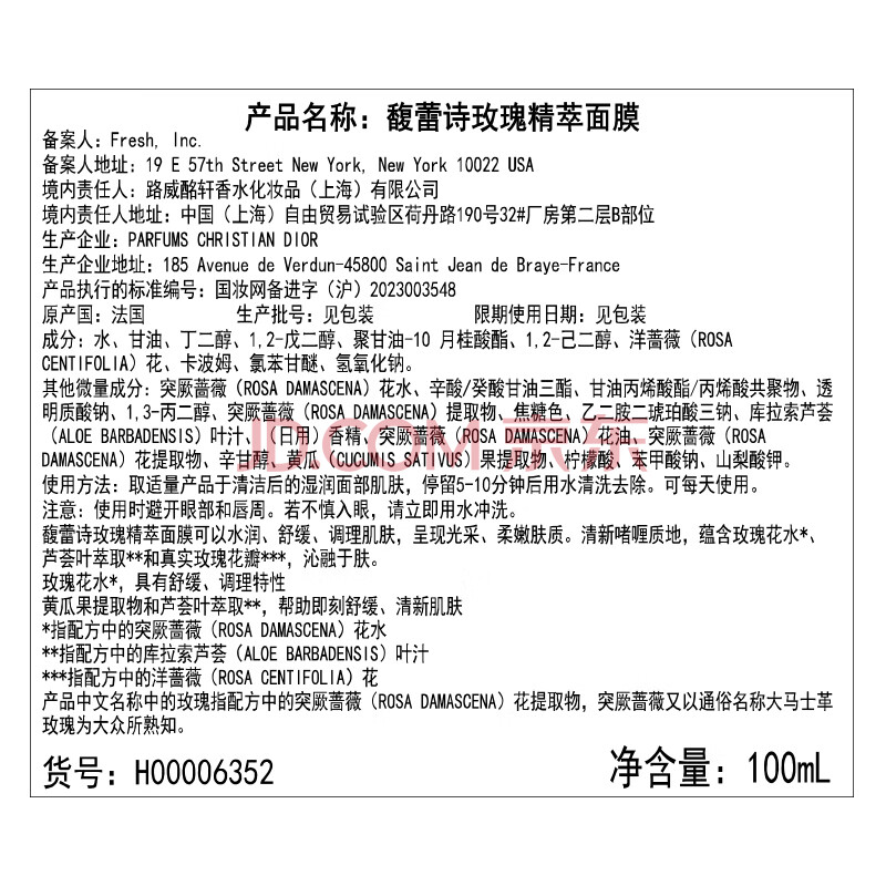 商品相册:Fresh馥蕾诗玫瑰精萃面膜100ml护肤品 生日礼物送女友送男友第