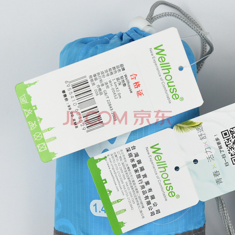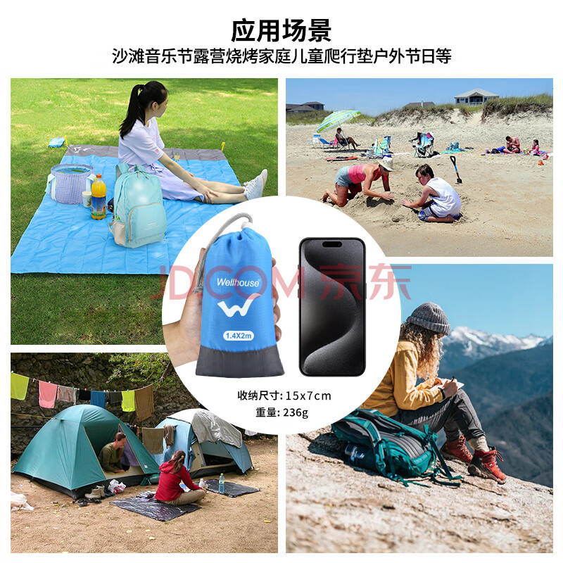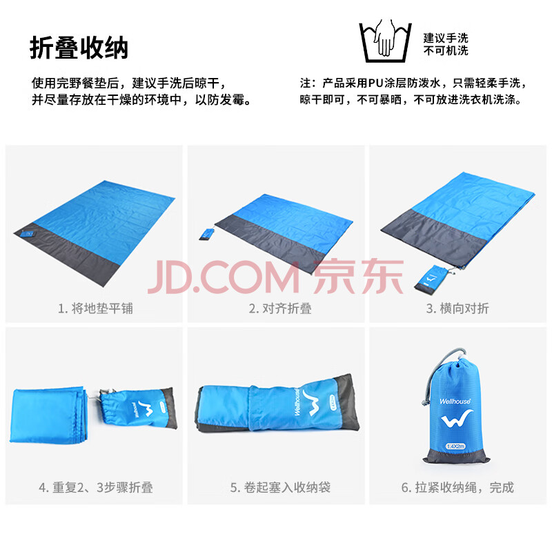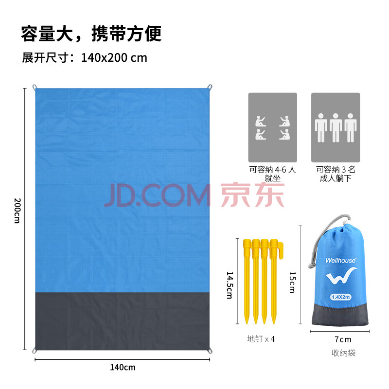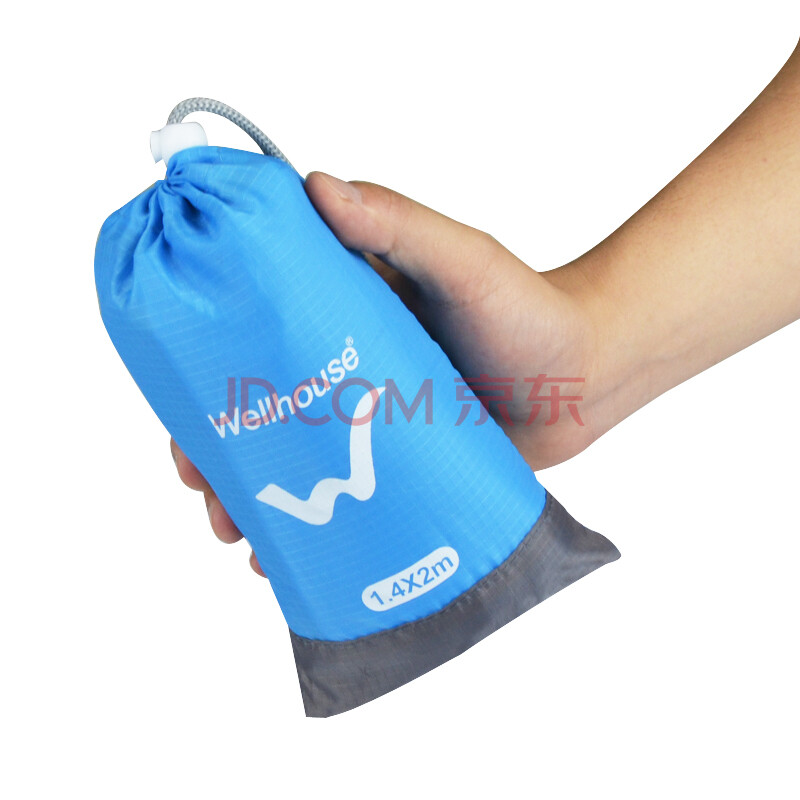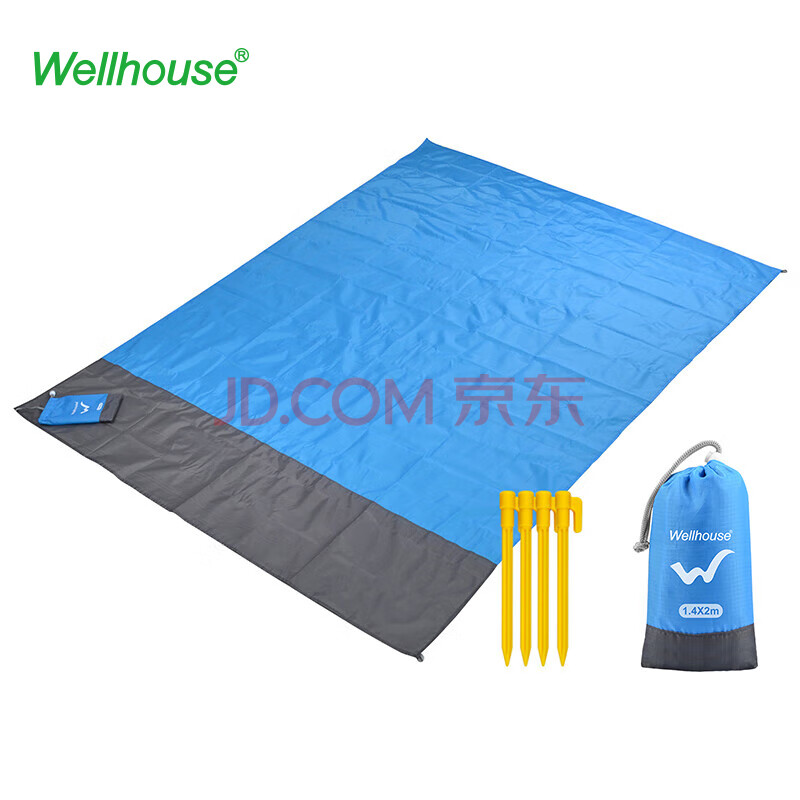 商品相册:WELLHOUSE户外防潮垫折叠帐篷地垫沙滩垫便携收纳袋带地钉蓝灰色1.4*2m第