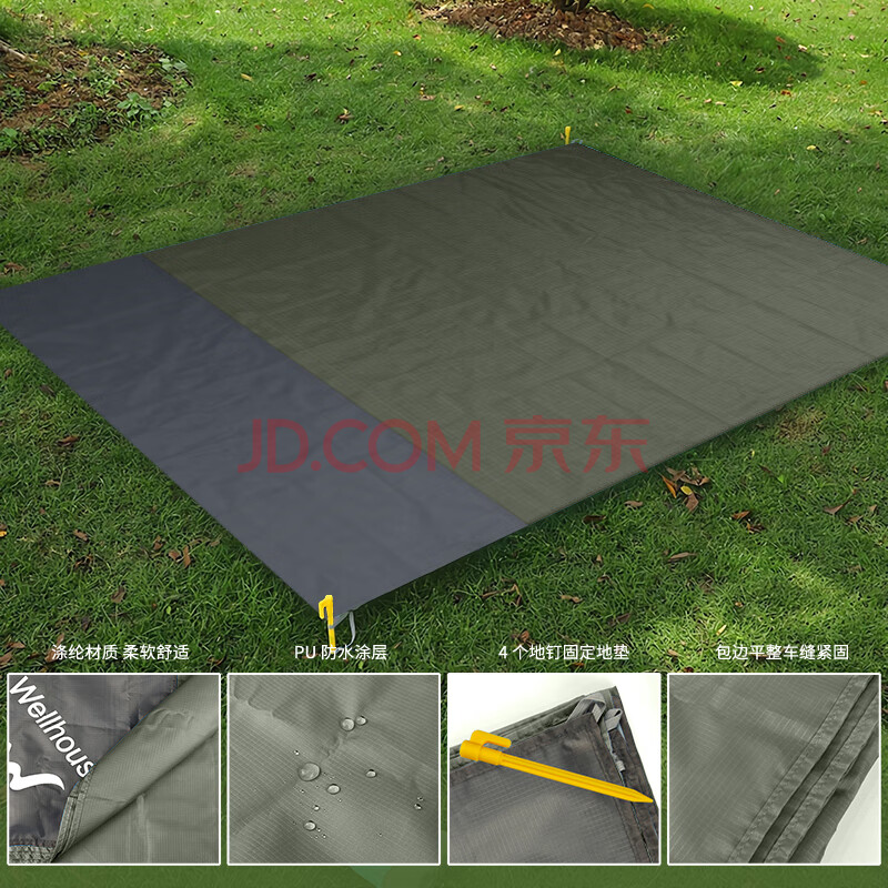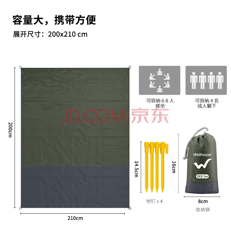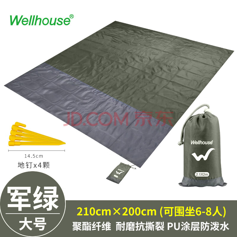 商品相册:WELLHOUSE户外防潮垫折叠帐篷地垫沙滩垫便携收纳袋带地钉 军绿色2.1*2m第