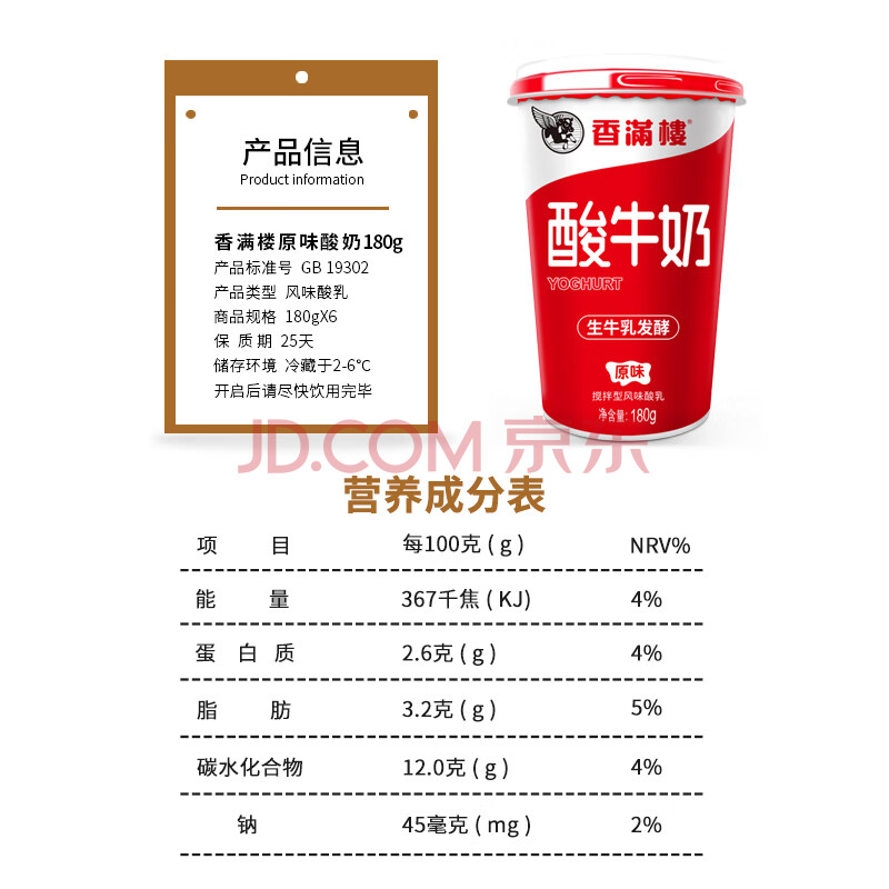 商品相册:香满楼 原味酸奶组装酸牛奶 180g*6杯 香醇丝滑 好喝无负担第