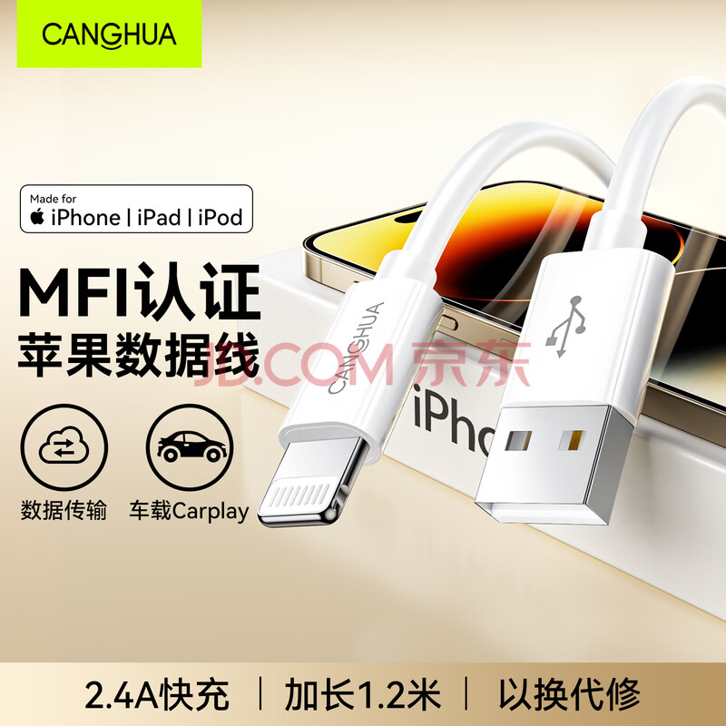 商品相册:CangHua【MFi认证不弹窗】苹果充电线快充数据线USB to Lightning闪电接口iPhone14/13/12手机平板1.2米第