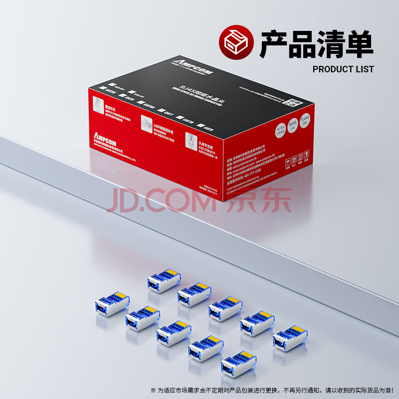 商品相册:安普康(AMPCOM)六类屏蔽FTP网络水晶头 CAT6类千兆工程网线RJ45电脑网口50U纯铜镀金8P8C网络接头100个AC6B10BU第