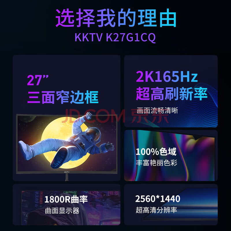 商品相册:KKTV 27英寸 2K高分 165hz高刷 曲面R1800 显示器 大屏电竞 游戏液晶全面屏 可壁挂 K27G1CQ第